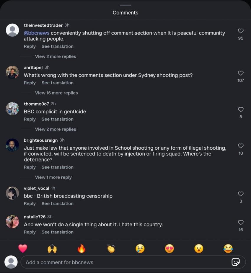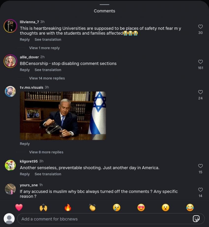 BBC 인스타그램 공식 계정이 해당 사건 관련 포스트에서 댓글창을 막아버림