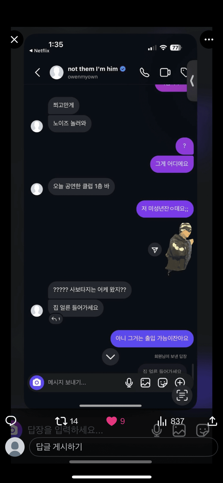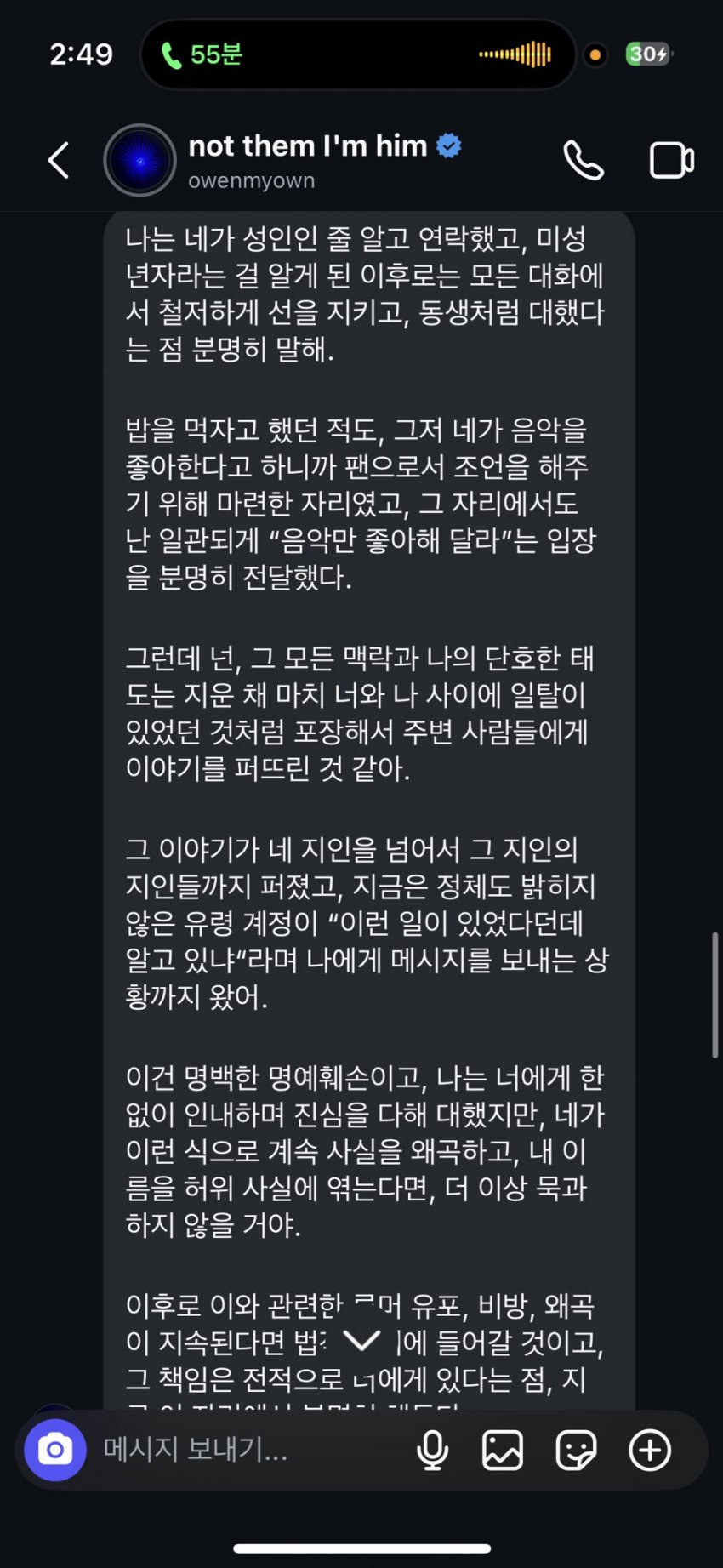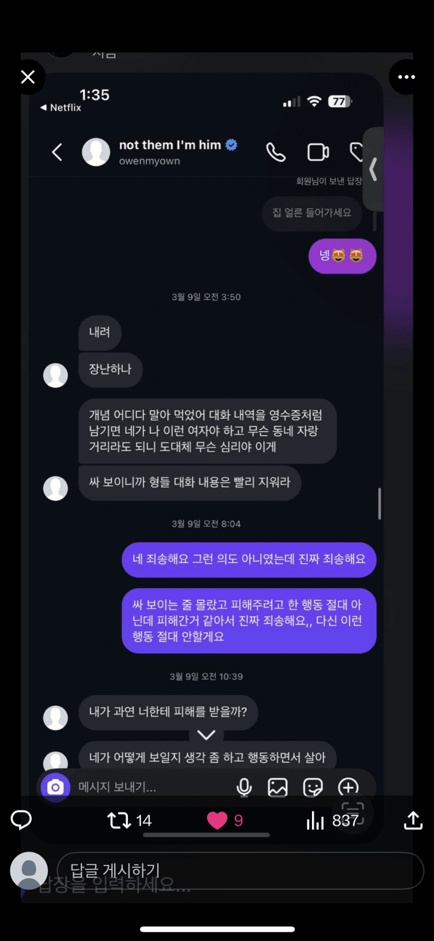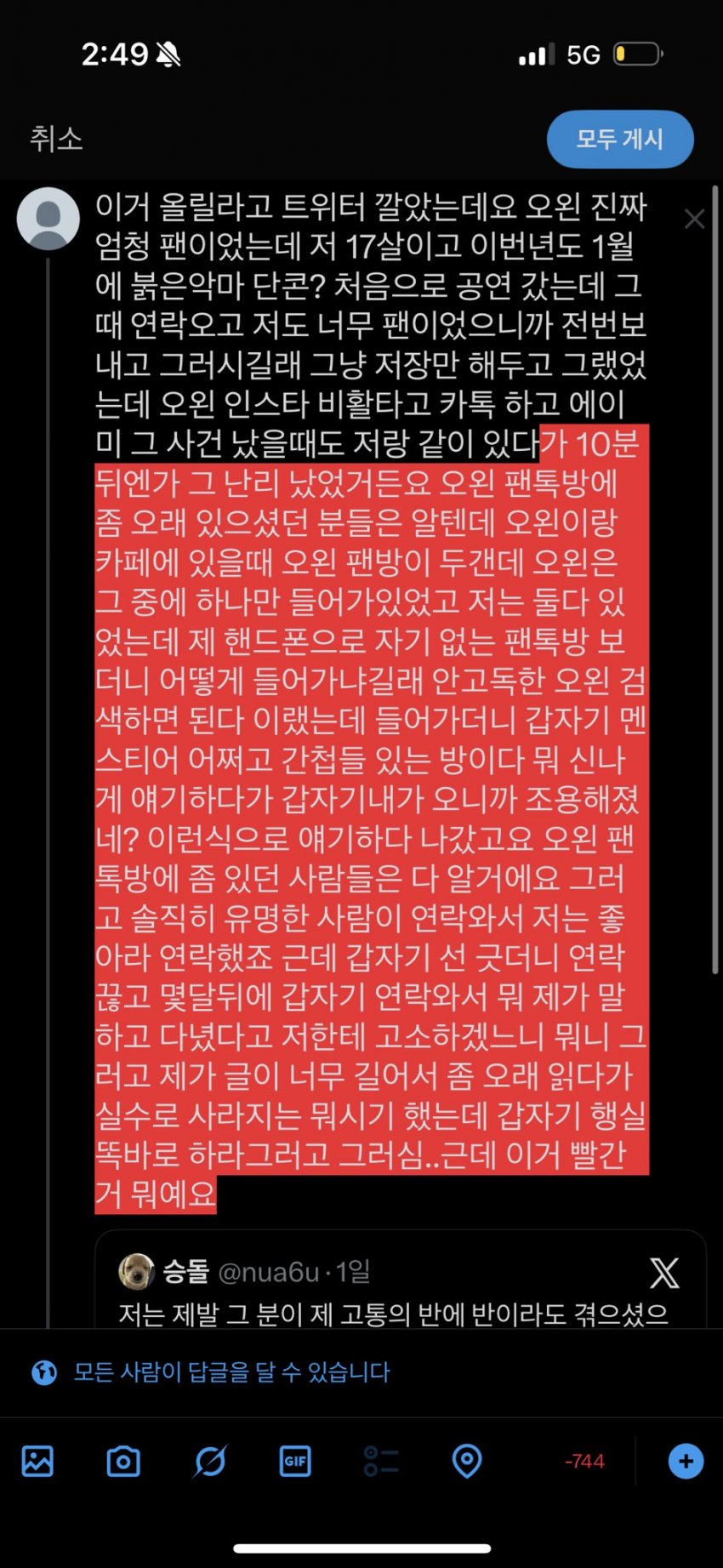 오왼이 팬이랑 썸타다가 알고보니 미성년자라서 썸은 끝났고, 그 미성년자애가 오왼이랑 연락한걸 유출했다는 내용임?? 뭐가문제지??