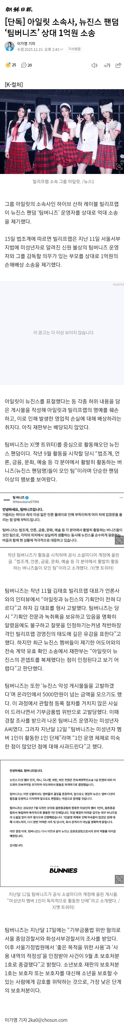 아일릿 소속사, 뉴진스 팬덤 ‘팀버니즈’ 상대 1억원 소송