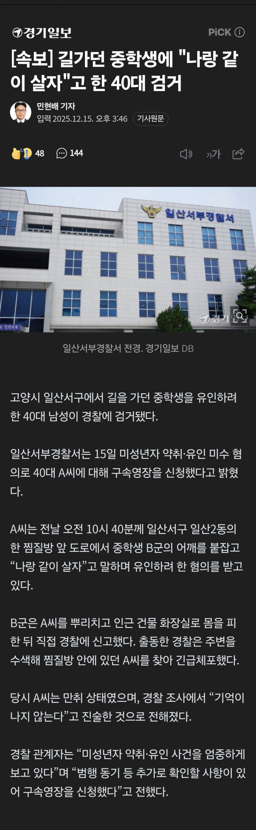 얘들아 기사 지문 잘 읽으라고 B양이 아니라 중학생 B군에게 같이 살자고 영포티가 프로포즈 한거라고