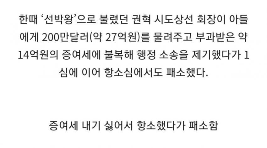 찢도 권력으로 재판 무기한 미루는데 저 사람도 한국 조선업에서 그정도 권력가인거지징역4년+벌금 2200억 1심이 2심에서 집유8개월+벌금 2억으로 줄어든것도 저 사람이 조선업에 큰 영향력 가지고 있으니까 솜방망이 처벌 해주고결론은 한국에서 선박왕 저 사람 못건드림