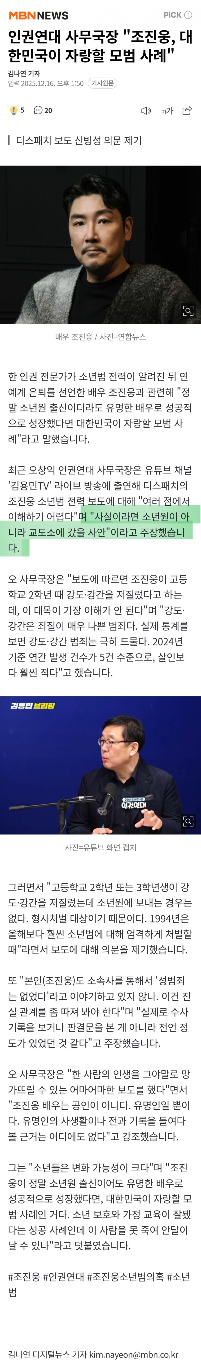 조진웅은 그냥 조용히 잊혀지는게 나은데 꾸역꾸역 실드치는거 보면 진짜 이해가 안가네 조진웅 계속 끌어올려서 자살시킬려는거야 뭐야 대체