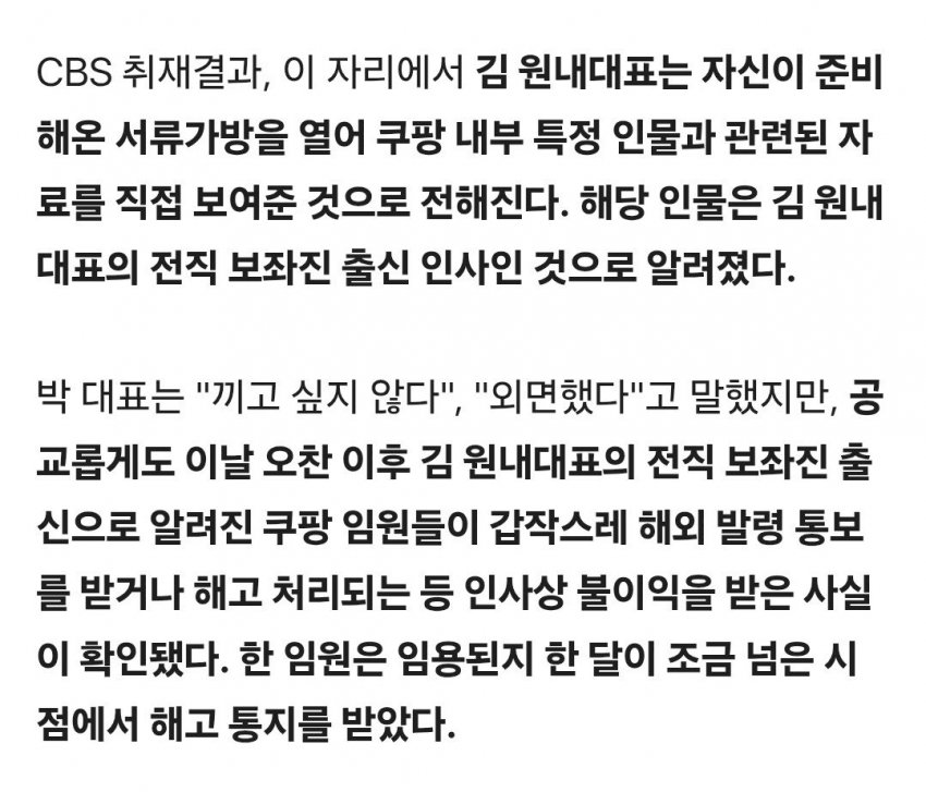 전직 보좌관 출신으로 쿠팡에 채용된 사람 관련된 서류를 보여주니까 그사람+다른 보좌관 출신 인사들을 숙청했다는 소리임?