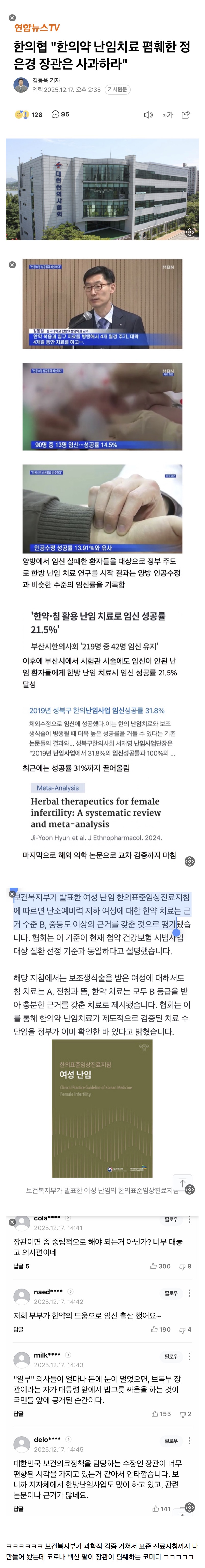 임상 실험 결과도 있다는데 이거에 반박하는 결과도 못내놓고 한의학은 민간요법 웅앵ㅇ