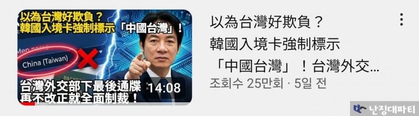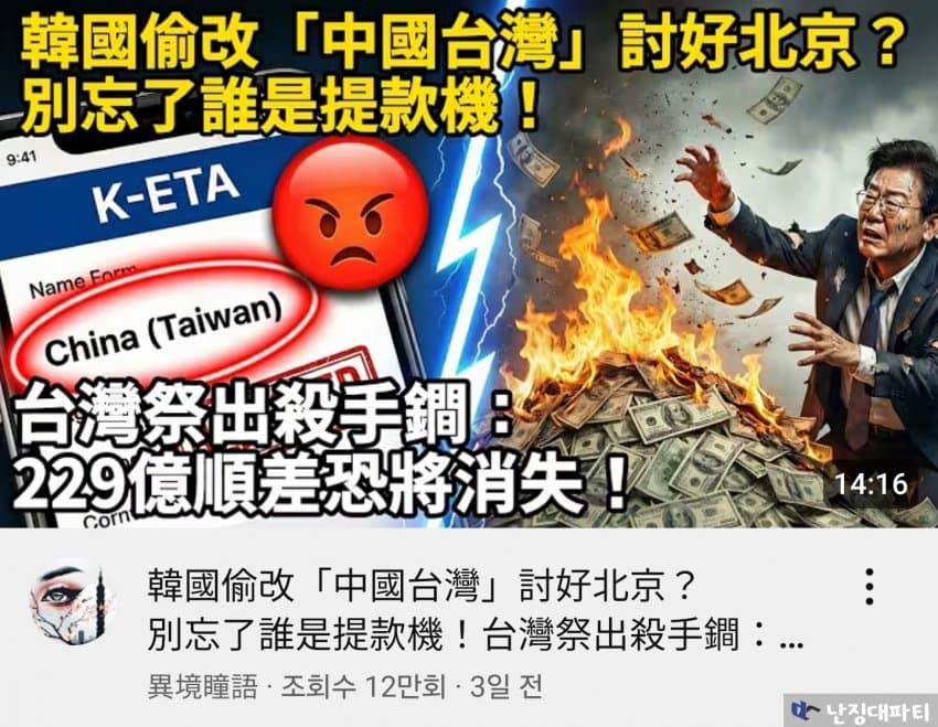 여튼 그 와중에 저 K-ETA 표기 문제로 대만이 한국-대만 관계를 전면 재검토하겠다고 폭탄선언을 하자 한국 각계각층이 엄청난 충격에 빠졌다고 함