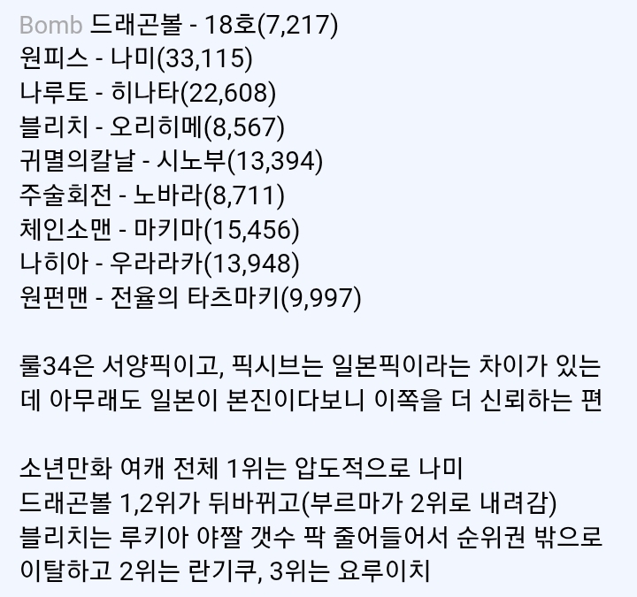 그냥 순위를 내야지 만화별 순위는 뭐노?? 전체순위 내면 도라에몽 이슬이가 1위일거 같은데