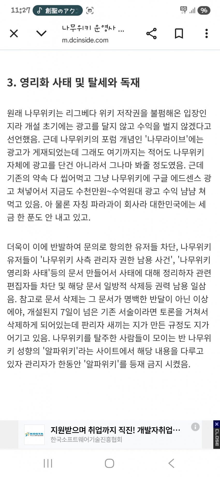 나무위키는 애초에 비영리로 운영할거라고 하면서 저작권 무시하다가 갑자기 법인파서 회사만들고 광고 넣은 다음에 지들비판하는 문서는 싹다 천안문하고 깨끗한척한것부터 맘에 안들음