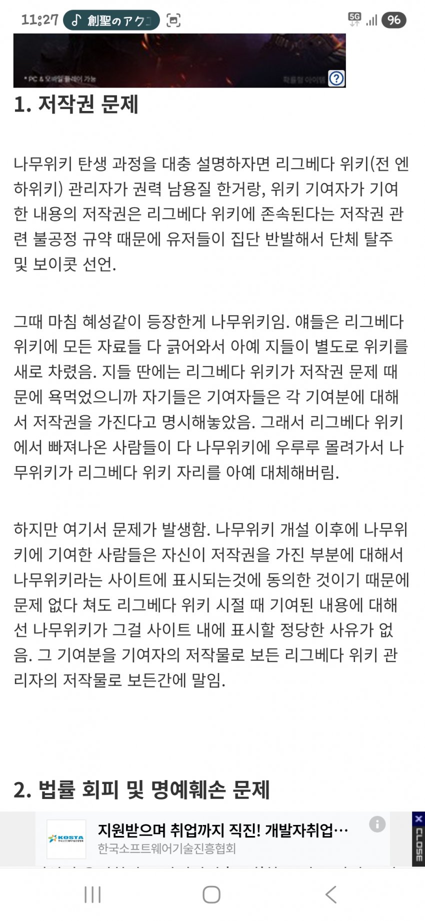 나무위키가 큰 이유가 국내 온라인 정보를 네이버가 선점중이었음구글에 검색해도 제대로 나올 게 없다가 나무위키가 뜨면서 뭘 검색하든 나무위키가 최상단에 뜨게 됨 결국 구글과 나무위키 두 범죄집단이 손을 잡은거지구글놈들 유튜브의 연예인합성 광고 사기 의약품 광고 중국산 가짜상품 광고 도박이나 사기용 가짜채널 야동댓글 신고 백날을 해도 차단 안 하더만