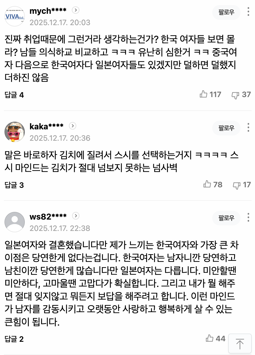 여기 댓글만 봐도 왜 정상적인 남성들이 국제결혼을 하는지 이유를 알겠노 ㄹㅇ