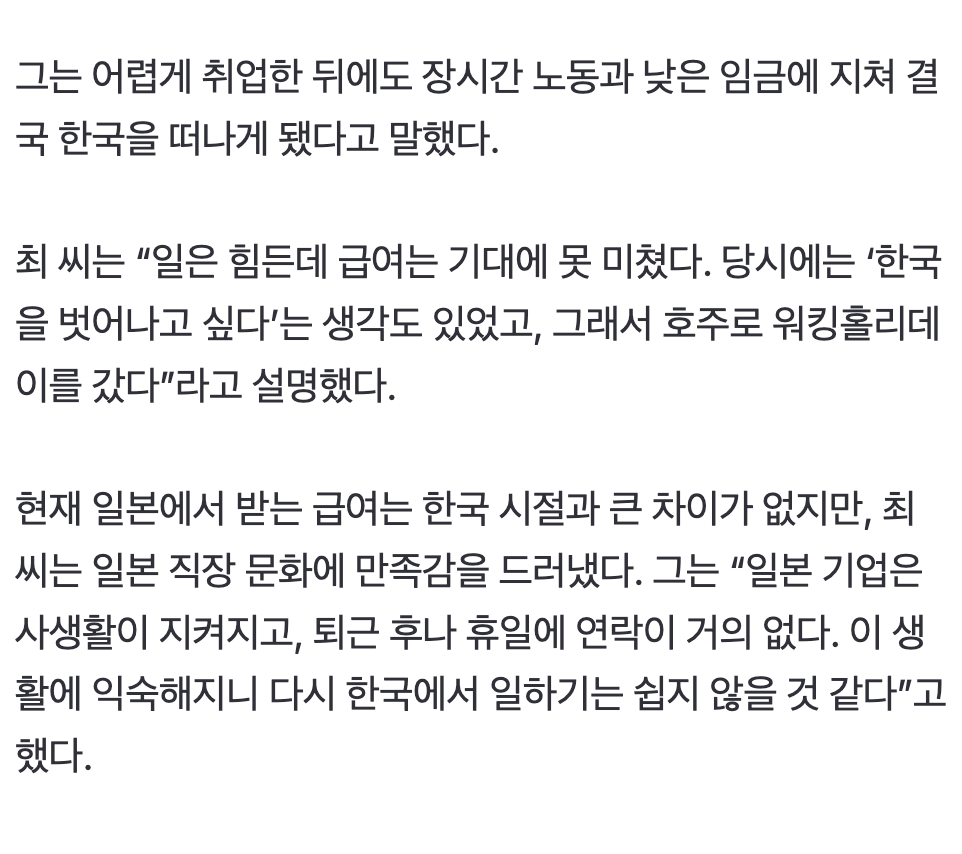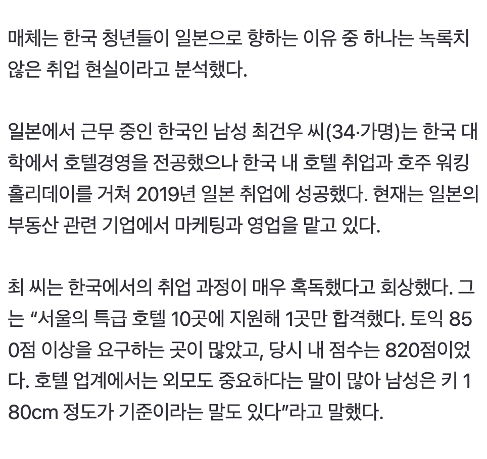 한국에 일자리가 아예 없는 수준이라 일자리 남아도는 일본으로 가는거네.한국은 그냥 끝난듯