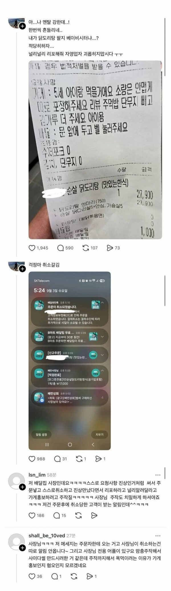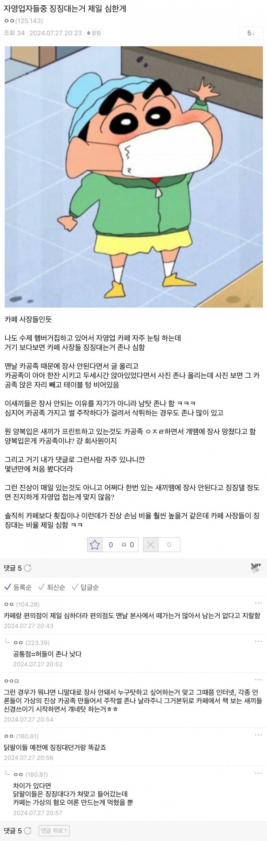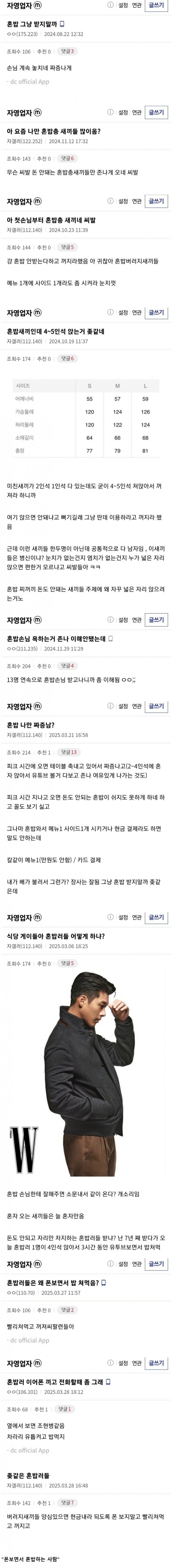 꼬우면 혼밥손님안받는다고 매장밖에써놓으셈 그거못하니까 저렇게 징징대는거아니냐 하나만해라