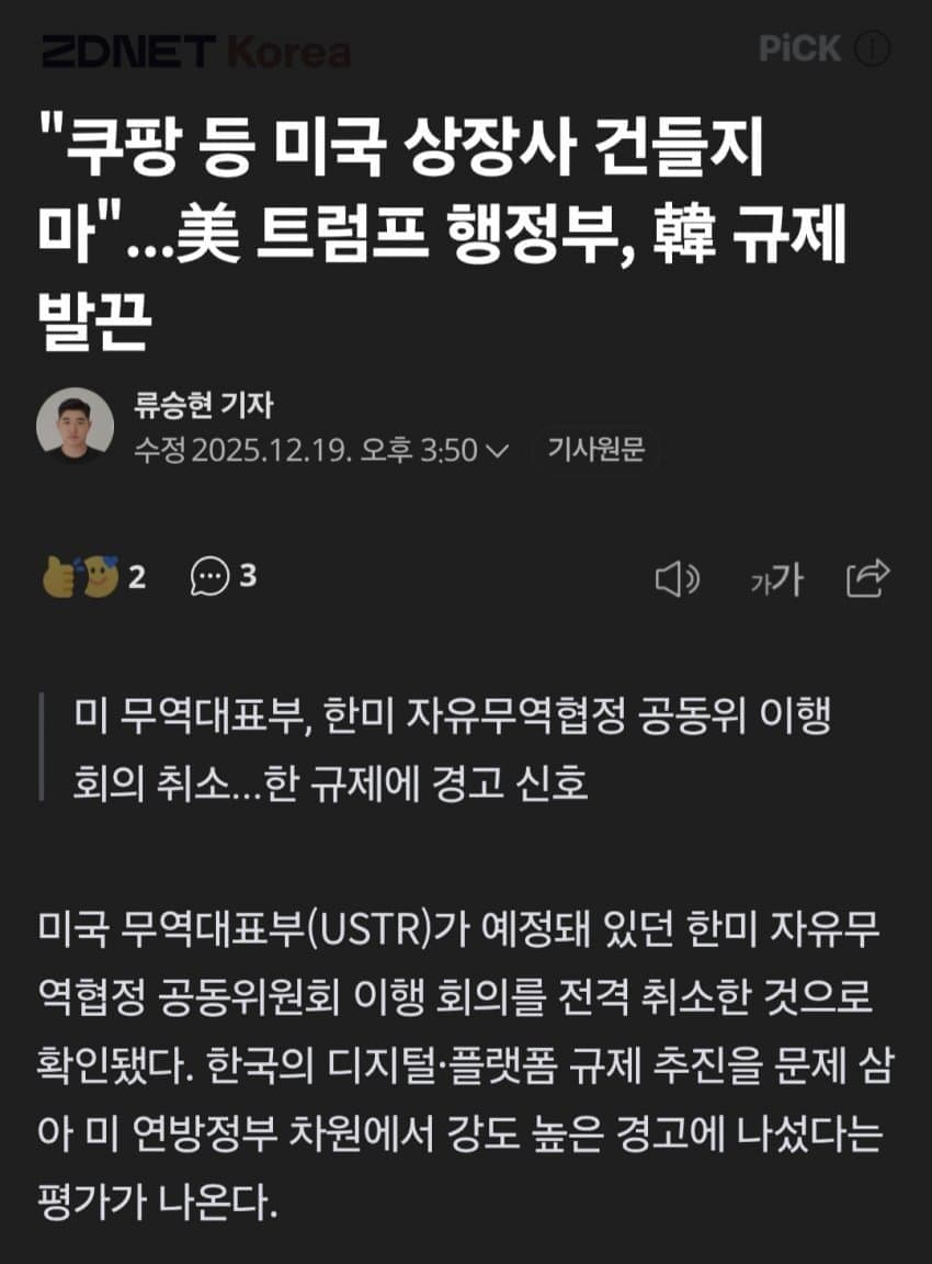 맞는 말이긴 함. 영업정지나 기타 규제로 쿠팡 팰라고 하면 답 없긴 해. 미국 입장에서는 본인들한테 세금 내면서 자국민 피해는 거의 없음. 왜냐? 이용자는 다 한국인들이니까;;; 즉 미국 입장에서는 일종의 드레이크 선장 같은 거임. 다른 나라 돈 뜯어오고 그거 다 미국에다 내니까. 근데 이게 좁밥 국가면 걍 규제 때리면 되는데 미국은 워낙 다른 나라에 간섭 많이 되어 있고 특히 한국은 미국 꼬붕이나 마찬가지지. 거기다 미국은 무역법 301조로 법적으로 보복할 수 있게 해놈 ㅋㅋㅋ 걍 건들면 좃 돼는 거. 그럼 답은 하나밖에 없음. 신토불이 운동이지 머, 비슷한 한국 플랫폼 찾아서 정부가 그쪽에 적극 밀어주는 거임. 네이버도 아마 마켓 컬리 그 방향으로 잡은 거 같은데 문제는 마켓컬리도 해외지분 장난 아니라서