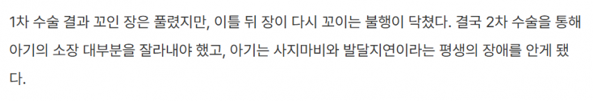 소아응급수술 실패해서 신생아 아기가 창자를 왕창 들어내고, 전신마비 발달지연 인지저하 왔는데도