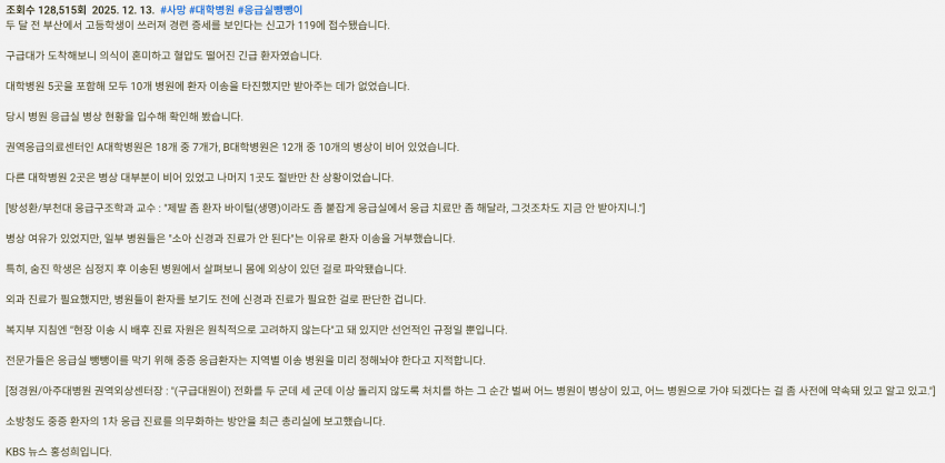 사실은 절반 넘게 병상 텅텅 비어있었고, '외상이 심했던' 학생은 응급처치조차 제대로 받지 못하고 어린 나이에 차가운 길에서 객사함.