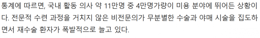 거기에 증원은 또 25년간 틀어 막아서 만성적으로 의사가 극도로 부족하기 때문임 (활동의사 11만, 그 중 미용의사만 4만명)