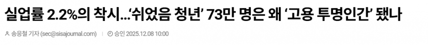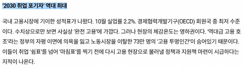 더 의문인 건 표면적으론 정부입장에선 쉬었음 청년을 유행시킬 이유가 없음 그냥 실업률만 들이밀면서 우리는 완전고용 상태다 취업난은 단순히 눈높은 청년들 탓이다라고 선동하면 그만이거든 쉬었음을 부각시켜봤자 지들 실책만 늘어나 지들 손해야