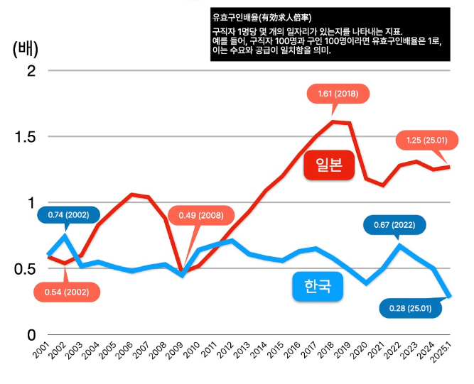 노동유연화를 안 해서 그렇다? 쉽게 해고하면 일자리를 쉽게 얻을 것이다? 구인배수가 1이 넘는 미국은 그게 가능할지 모르나 구인배수가 0.2~0.6 사이로 놀고 있는 한국에선 40대 이후 재취업이 막히는 형태로 나타남 팀장급을 잘라봤자 팀장 밑의 직급이 그 빈자리를 메꿀 것이고 어차피 T.O가 한 자리 줄어들었으니 한 명씩 승진하면서 생긴 빈자리는 사실상 없어진 거고 청년이 차지할 수 없음 청년이 중간관리자 일자리에 바로 들어갈 수 있는 것도 아니고 ㅇㅇ