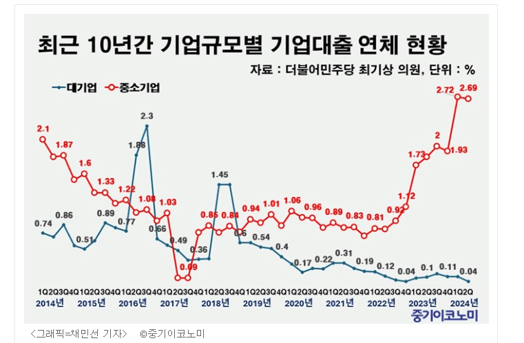 그렇지만 물탱크에 구멍이 난 걸 호미로 막아봤자 시간만 끌 수 있을 뿐임 기업의 대출연체율은 윤정부 22년 3~4분기에 폭증하여 현재도 높은 수준을 유지하고 있음