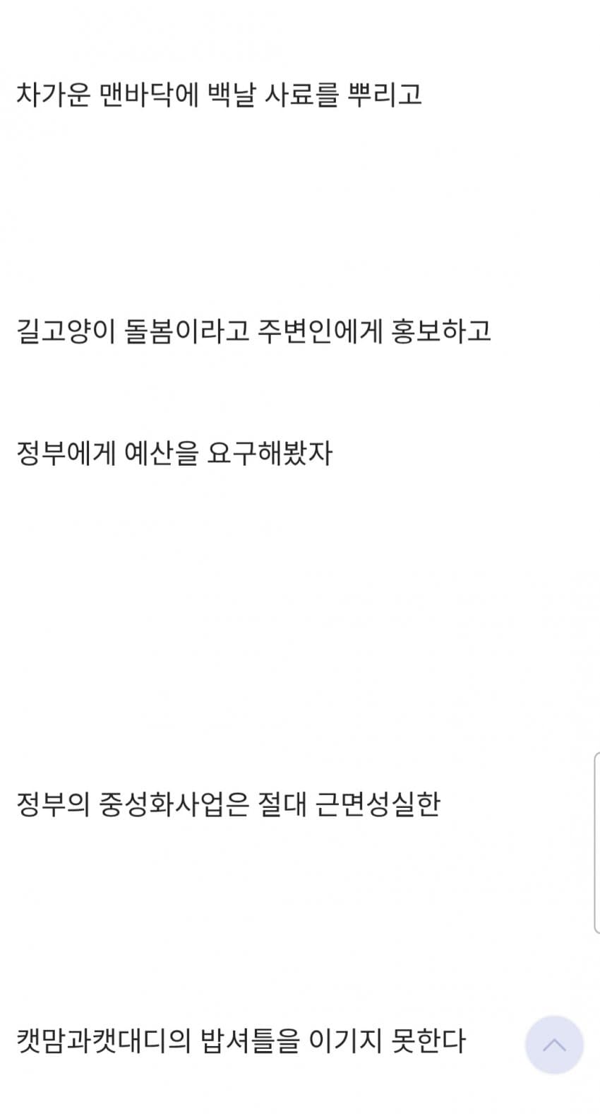 캣맘들 응원하기로 마음먹었다이대로 개체수 조절에 실패해서 늘어나면 세계흐름에 따라 유해조수 지정되서죄다 살처분 시킬 수 있겠네