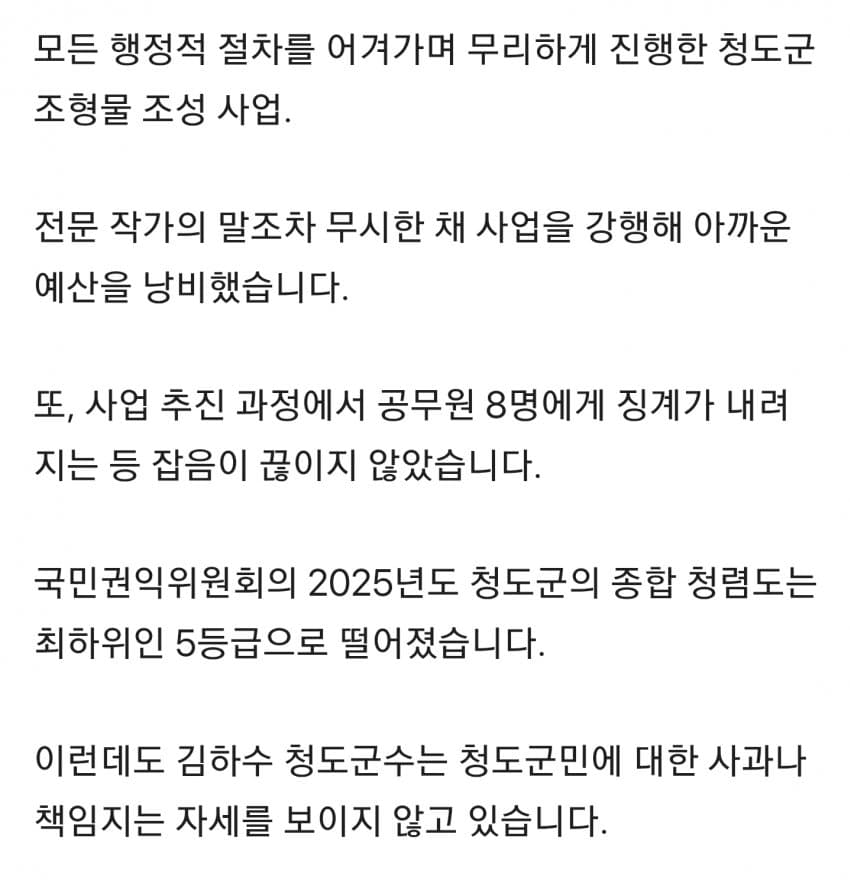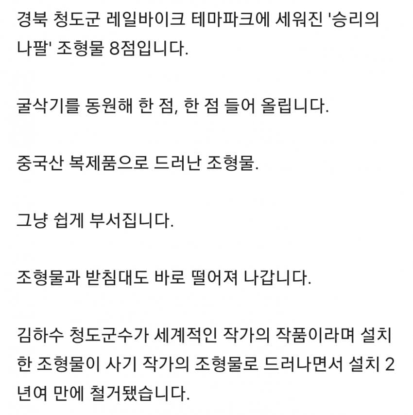 저런 조형물이 요즘 지자체에서 횡령할 때 자주 쓰는 수단임... 운동권 후배나 친척, 외국인 등을 유명 조각가라고 내세워서 중국산 쓰레기를 수억씩 받고 나랏돈으로 사들임. 이미 신안에서도 똑같은 사기하다 걸린 적 있음 ㄷㄷㄷㄷㄷ
