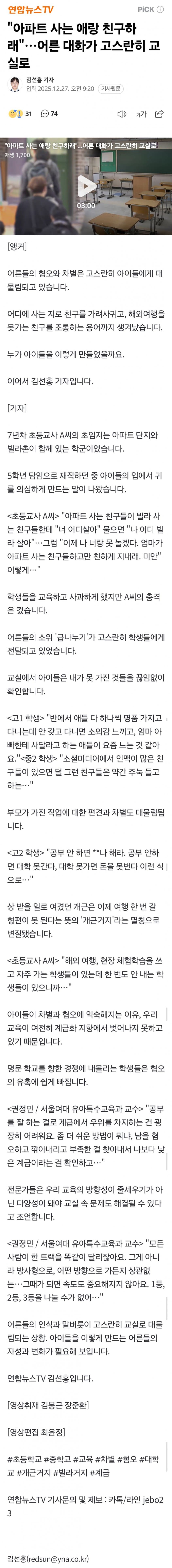 개쌉소리하지마. 살아보니까 저말이 맞어. 남들 괴롭히고 못살게 굴던 놈들 99%가 다 주택충임. 걍 얘네는 악에차있음 악질 그자체임. 부모 소환해서 얘기해봐도 콩콩팥팥 사이언스 그자체임. 아파트사는 애들 모아논 학원이나 학교는 학습 분위기도 좋다. 애들도 크게 엇나가지 않고 심성도 착하고 상식적이다