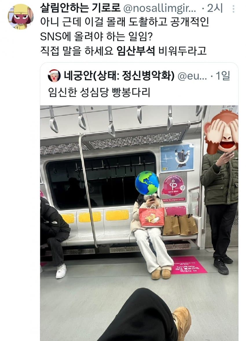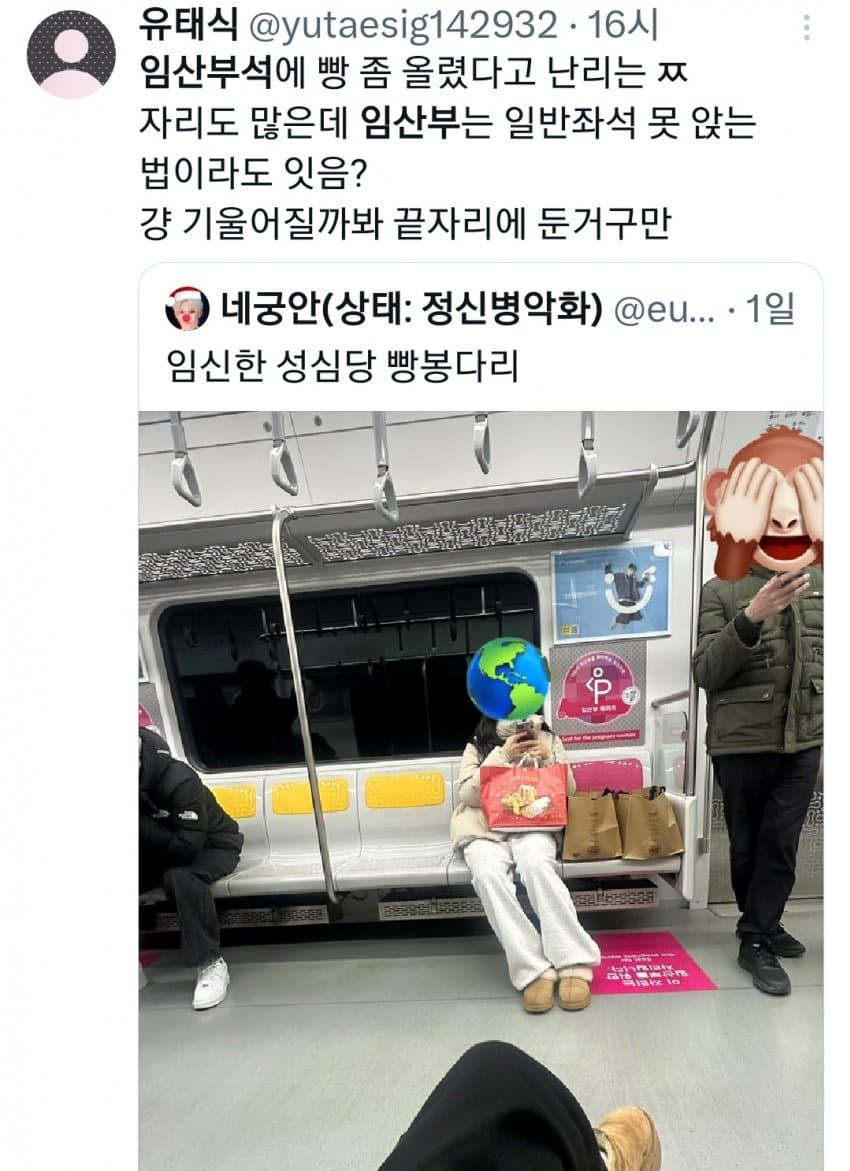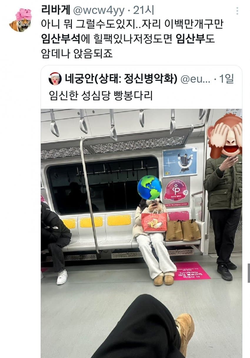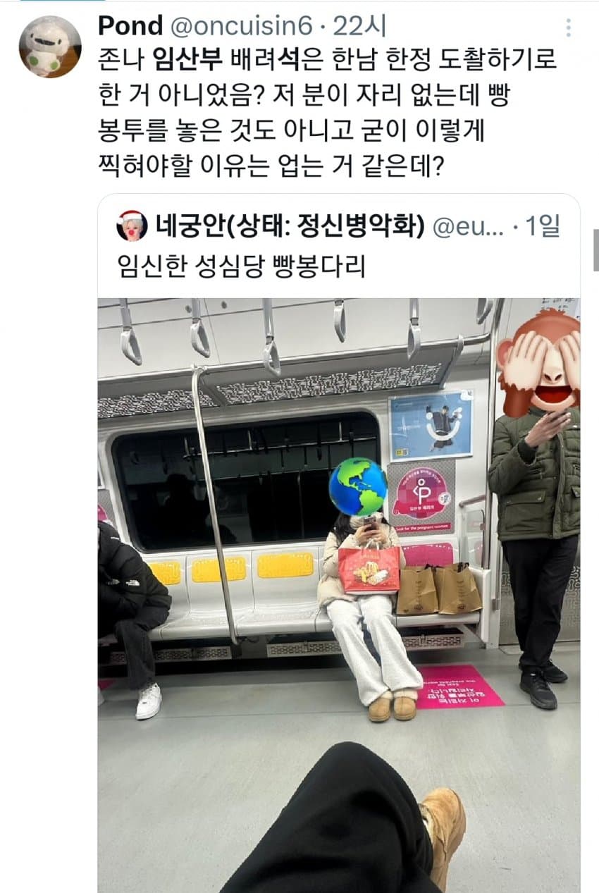 임산부 좌석이 사실상 아이랑 같이 타는 거잖아 저 빵봉지에도 아기가 있을 수 있는데 겉에만 보고 빵봉지라고 하는 건 좀 선넘은 거 같네
