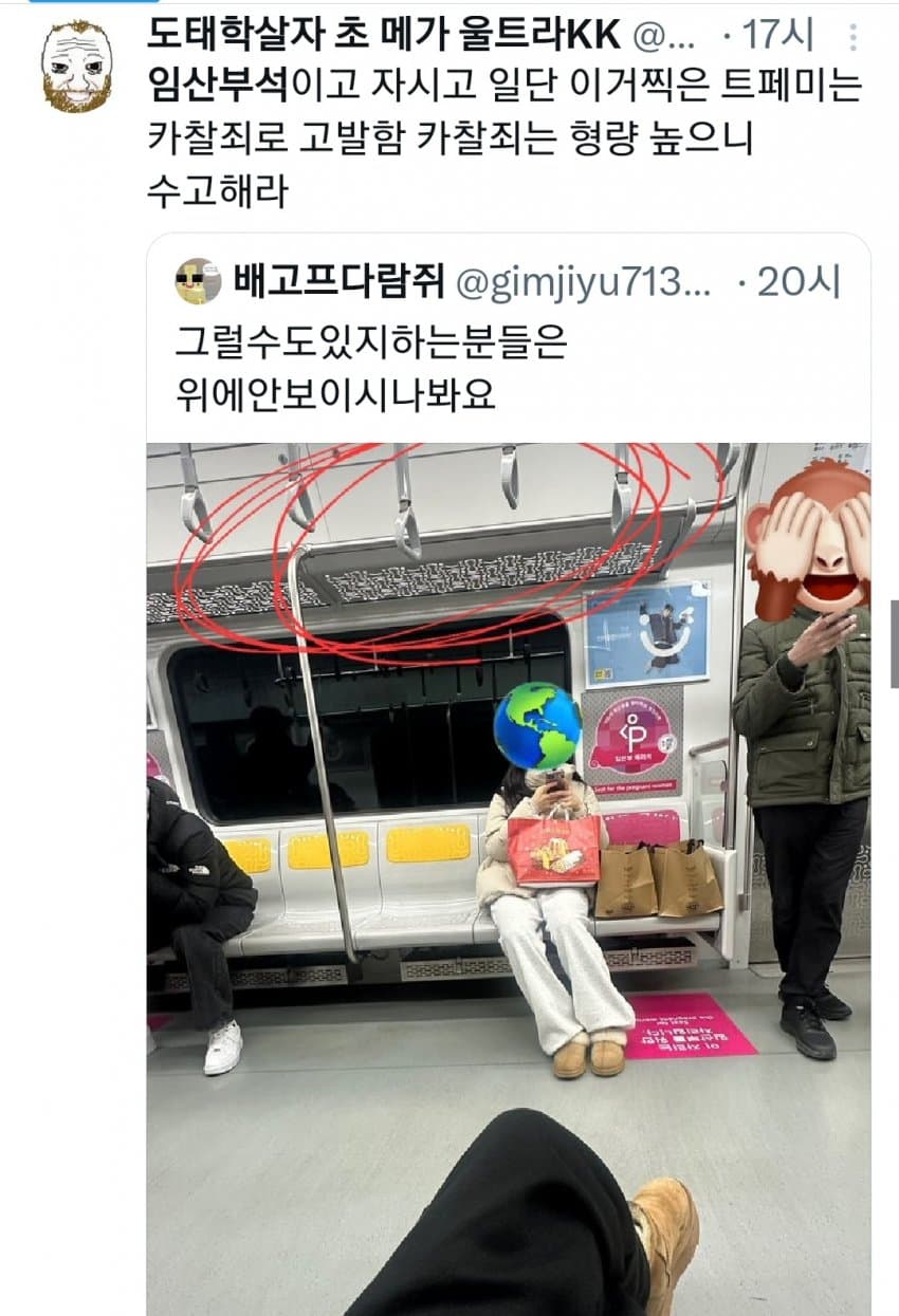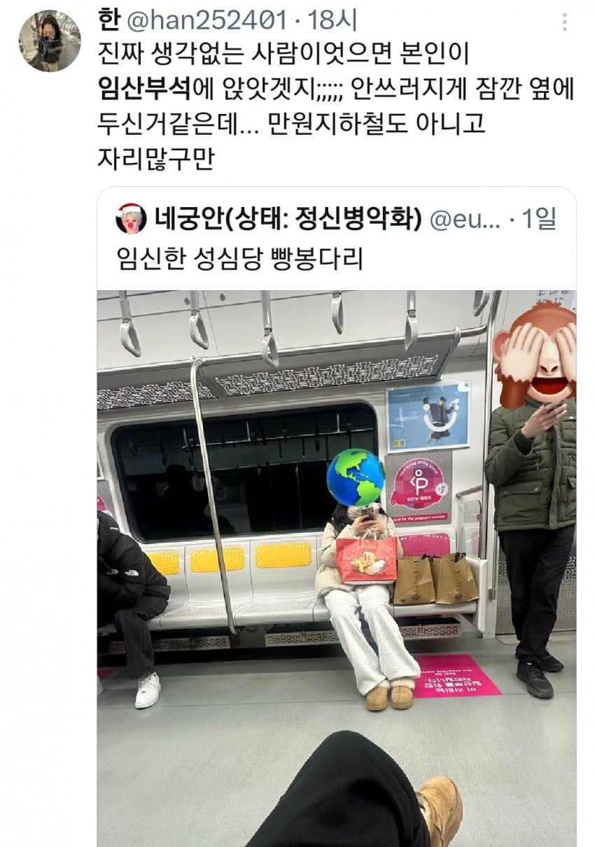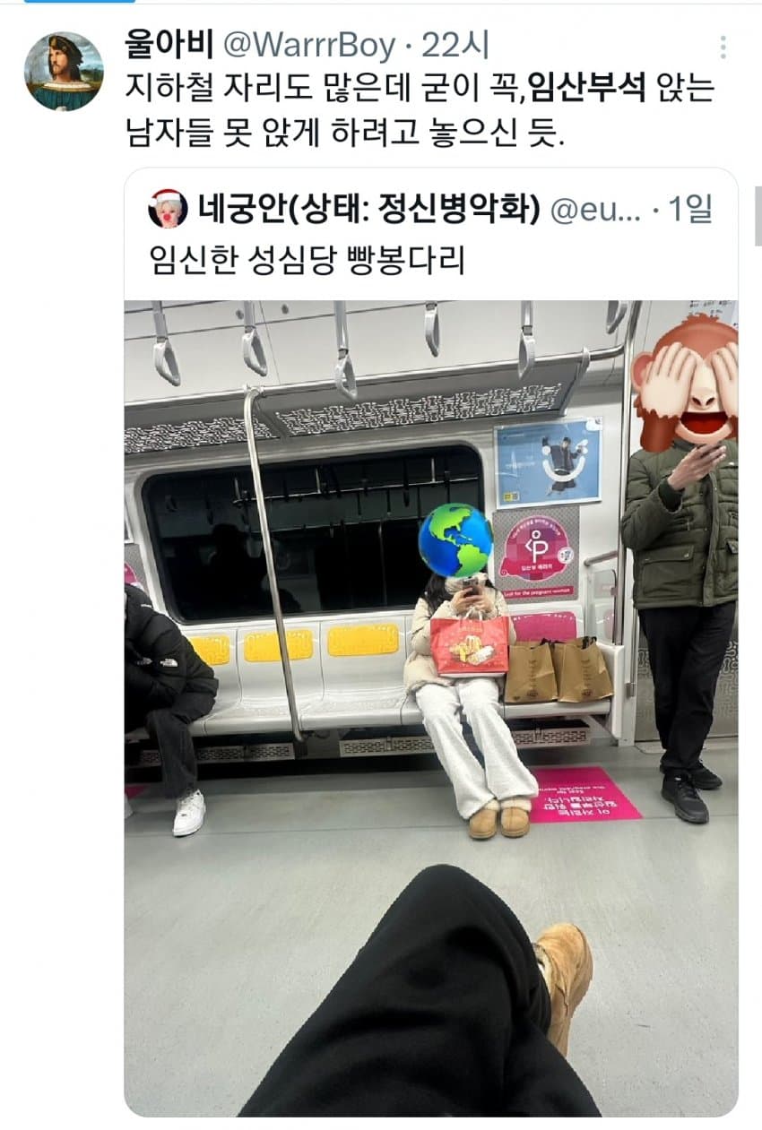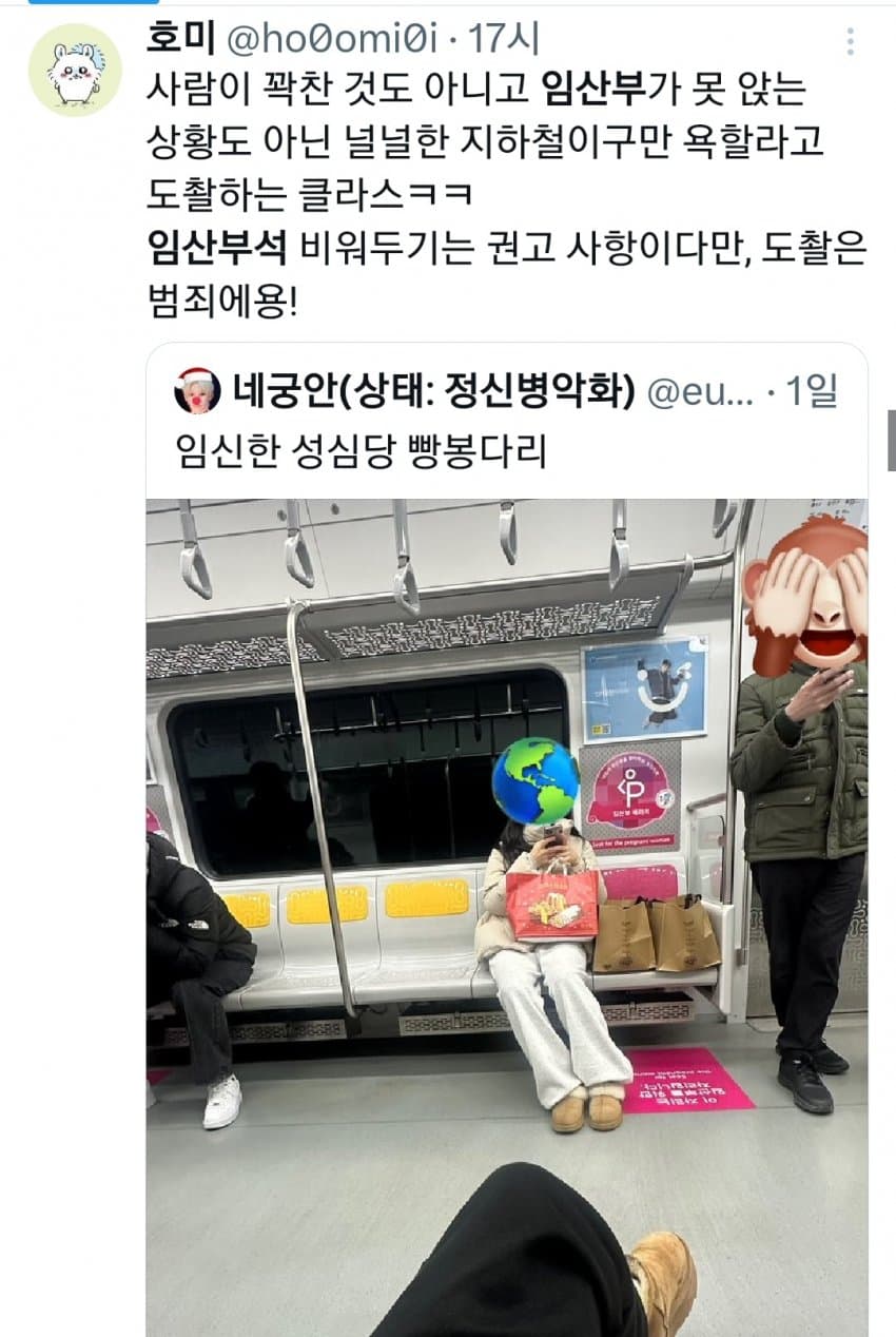임산부 좌석이 사실상 아이랑 같이 타는 거잖아 저 빵봉지에도 아기가 있을 수 있는데 겉에만 보고 빵봉지라고 하는 건 좀 선넘은 거 같네
