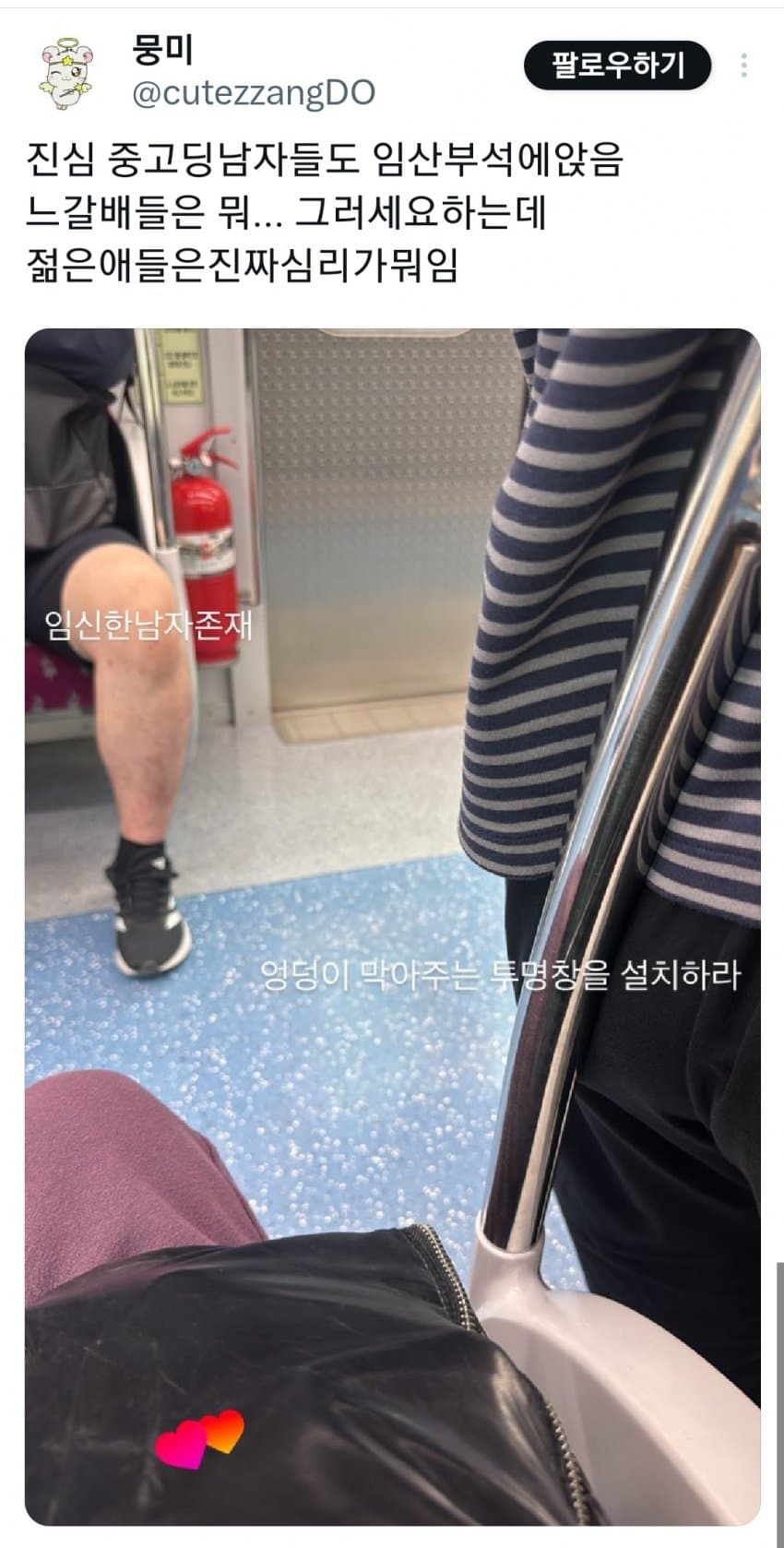임산부 보이면 비켜주면 되는거 아님? 임산부석 룰이 어캐됨? 걍 항상 저자리는 피하니 아는게 없내