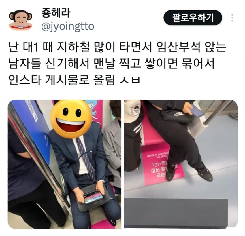 난 저런거 신경 안쓰고 걍 임산부석 자리 있으면 앉음.남탕 직장이라 저런거 사진 올라간다고 누가 알아볼 사람도 없고 어차피 사람들 기억하지도 못함결론적으로 임산부 오면 비켜주면 되는거 아냐 ㅋㅋ 출산율 0.65 국가에 임산부가 있겠냐만은ㅋㅋㅋㅋㅋ