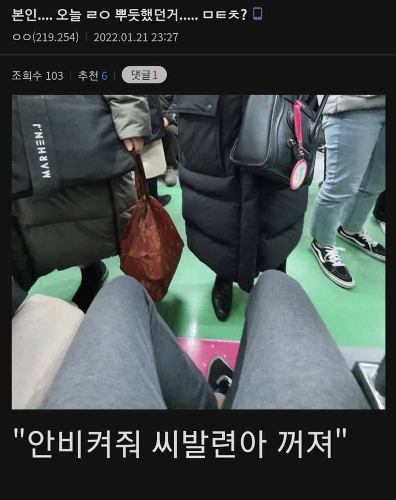 자리 많은데 굳이 저길 앉는다고 지껄이는 것도 가스라이팅이지ㅋㅋㅋ앉으면 어떤데?뭐가 문제? 갑자기 임산부라도 앞에 나타나서 자리없어서 발 동동거림?ㅋㅋㅋㅋㅋ