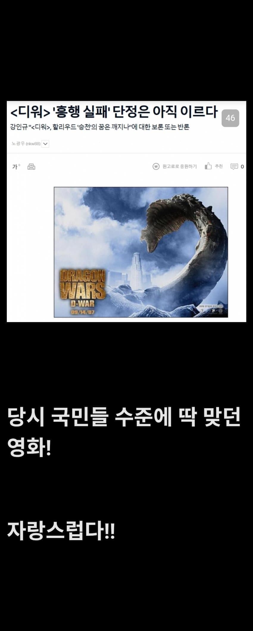 이거 누가 지어내는거냐????당시 개봉때 디워 종나게 욕했고 난리났었다개봉당시 트랜스포머가 개봉해서트랜스포머로 다들 열광했었다무슨 디워를 열광해 미친넘들아디워 욕한 세대가 지금의 영포티다좀 지어내지좀 마라