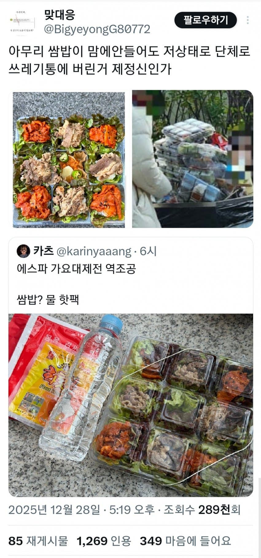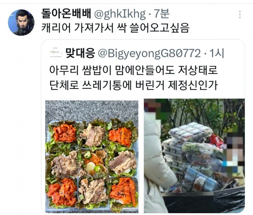 이건 또 무슨 난독증이냐 ㅋㅋㅋ에스파 역조공 선물이 맘에 안들어서 팬들이 버린거라자너