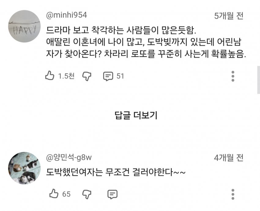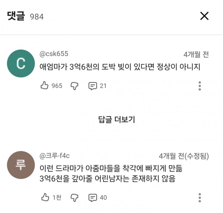 저게 도박 빚이냐? 다 애들 키우려고 양육비 벌어보려고 노력한 거잖아 젠더감수성 좀 키우고선 댓글들 달아라