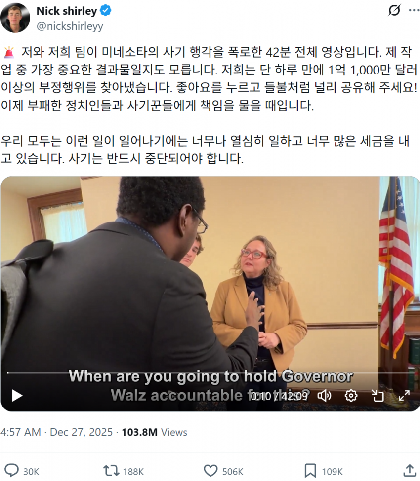 이번 미네소타 사기 중 어린이집 사기(데이케어)를 다룬 영상 조회수가 1억을 넘어버림