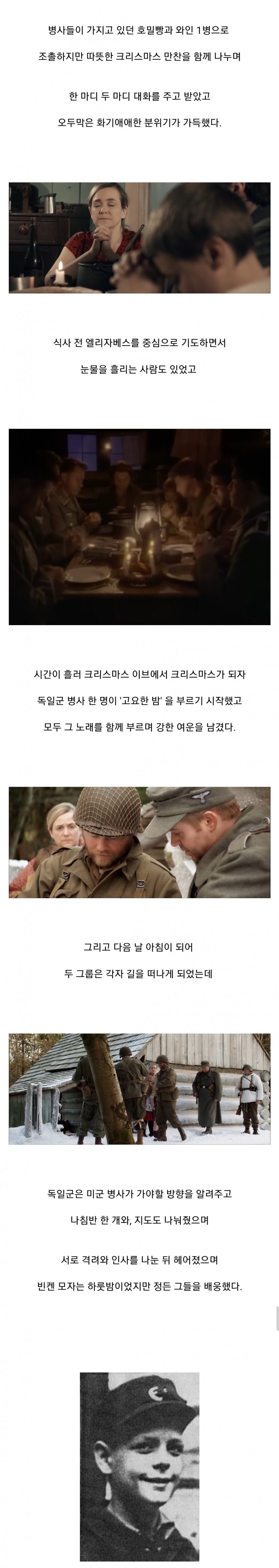 이거 리더스 다이제스트 한글판으로는 80몇년도에 실려서 그때 읽어봤었슴. 실화라고 믿기는 힘들더라. 크리스마스 이브 감성이라서. 설날에 한국군과 북한군의 만남이라면 이해했을지도