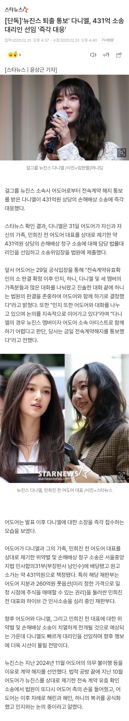 뉴진스 다니엘, 431억 소송 대리인 선임 '즉각 대응' (+민지 근황)