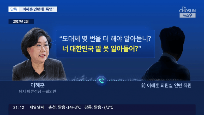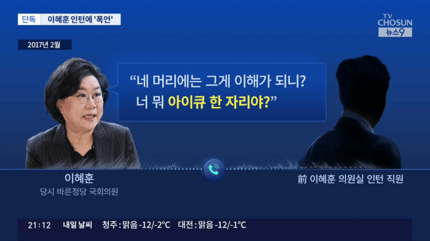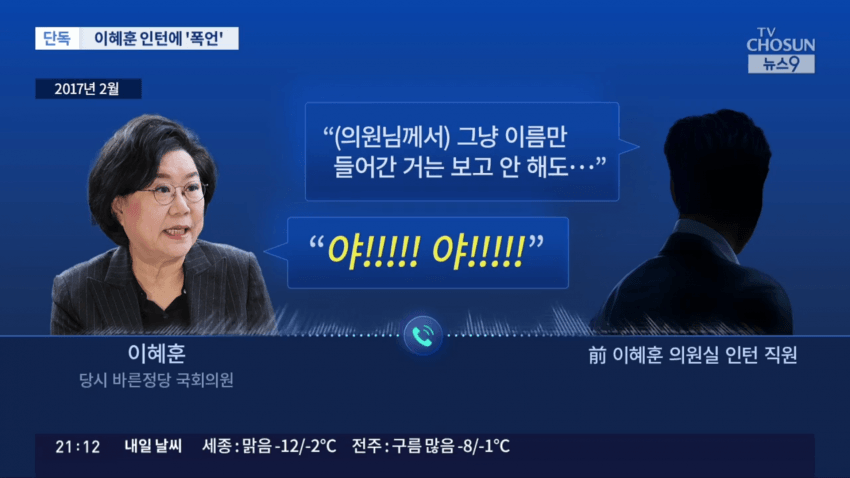 2017년, 바른정당 소속 국회의원이던 이혜훈 지명자가 인턴 직원 A씨를 질책합니다.
