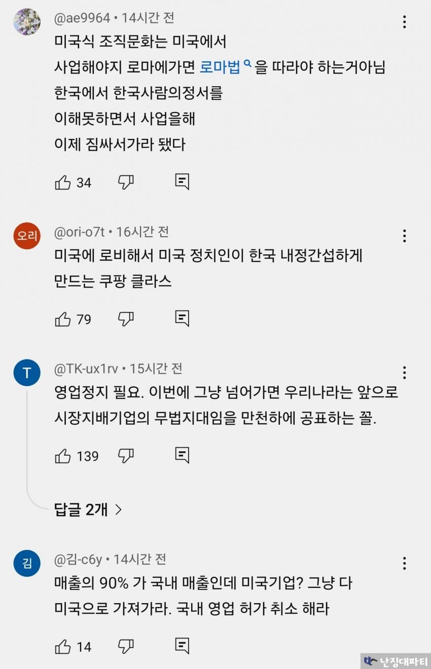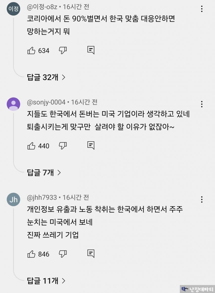 법적으로 문제 없으면 다냐?한국에서는 법보다 무서운게 민주당 괘씸죄야민주당한테 대들면 매번 대통령 끌어내리는미개한 나라에서 장사 하려면 한국 정서를 좀 배워 제발