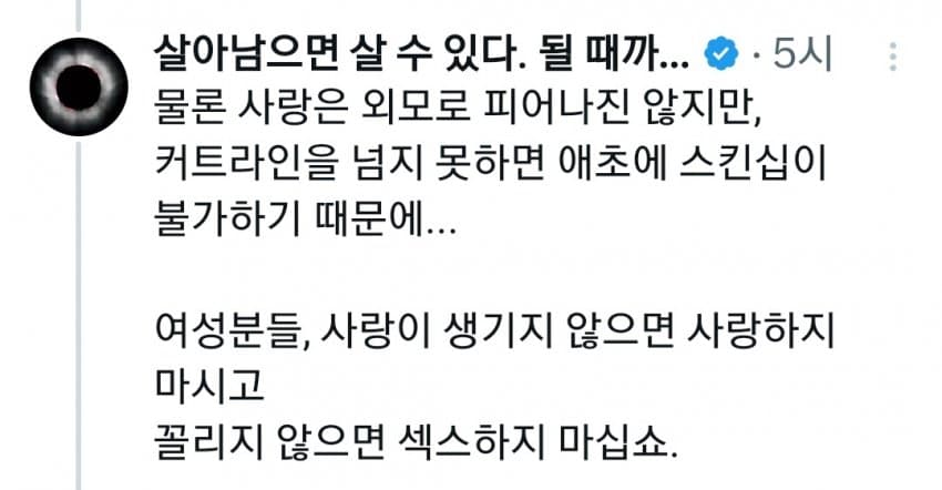무조건 외모가 중요하다는거임꼴려서 하는게 진짜 사랑이고안정감 돈 이런거때문에 사랑하는척하는건 여자만 가능한 연기이긴 함에겐남들은 여자가 쓰는 수법 그대로 쓸 순 있겠지만본래 남자라는게 시각적인게 제일 중요해서안이쁘면 시작조차 못하는거랑 똑같은거