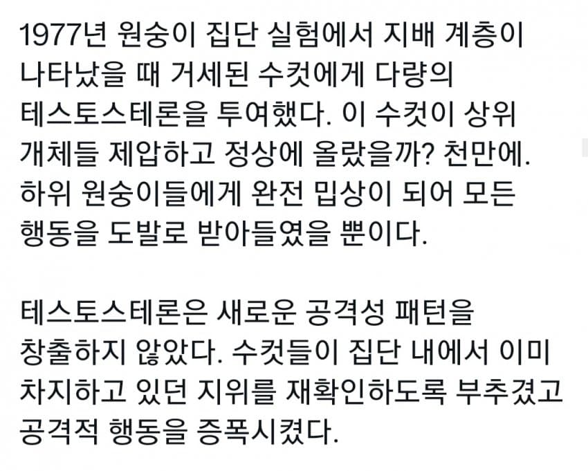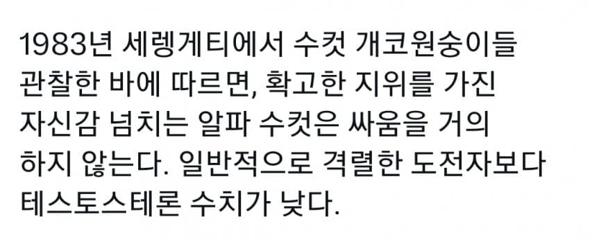 그래서 의외로 서열 낮은 수컷보다 남성호르몬이 낮음