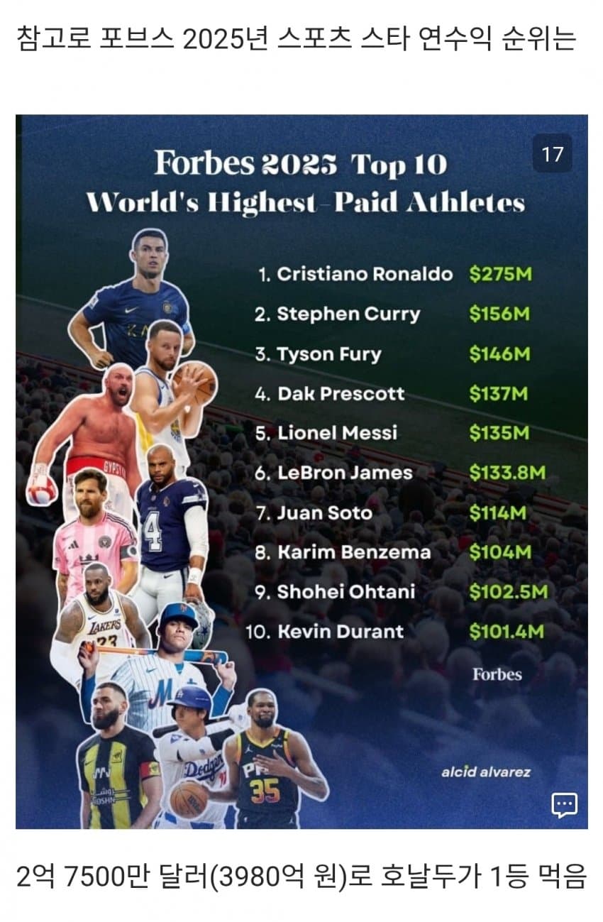 나이 40세에도 현역으로 전세계 스포츠 스타 연수익 1위