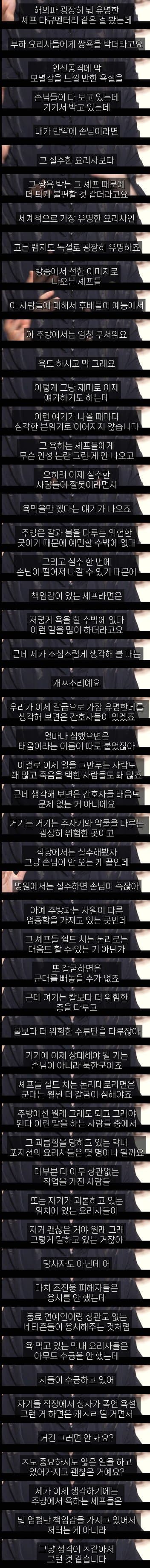 갈굼이 필요하다 불필요하다는 개인의 생각차가 있을수 있다고 보는데 학교 군대 직장등 사회에서 이미 부조리로 낙인찍고 법적으로 사회적으로 금기시하면서 유독 주방에서만 흠흠 셰프님들이 일 가르쳐야되는데 어쩔수 없지 이러는게 블랙코미디 그 자체임 ㅋㅋㅋ