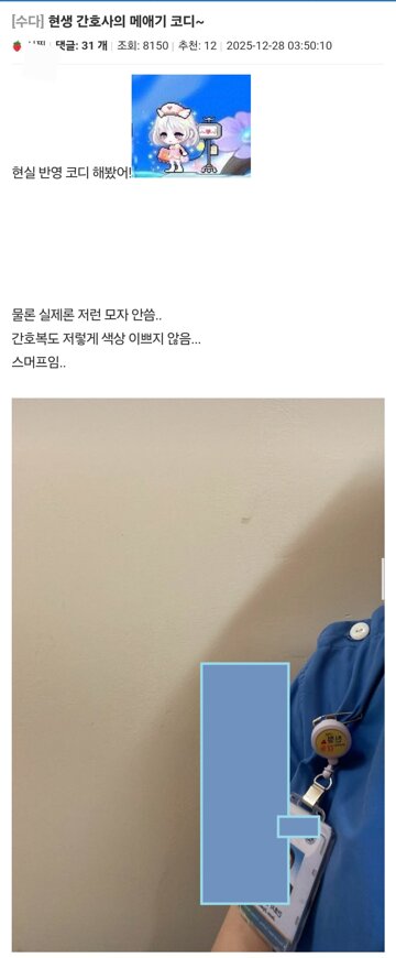 일단 유출 자체가 문제라서 민원 들어간거면 무조건 조사 진행하고 결과 낸다고 보면 됨. 가장 간단하게 끝나는게 짤이 도용이고 유출 간호사 없다인데, 주기적으로 티내고 대강 유추가능하게 활동한거면 실제 담당일 가능성이 커보임. 그러면 대개 인물 특정 되고 어떻게 처벌할건지로 넘어감. 아무리 낮게 잡아도 경고조치는 무조건이라 동 병원 내 간호사 커리어 그냥 끝