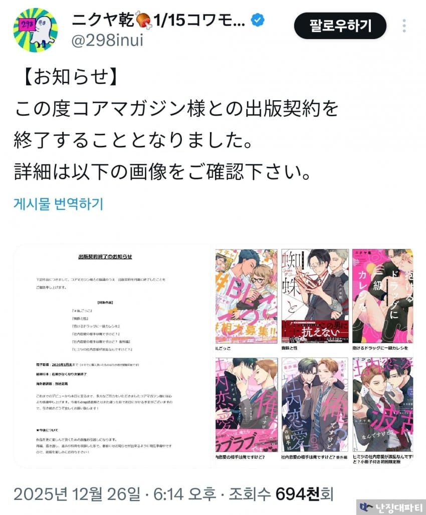 자신이 코어 매거진(일본의 출판사)과 계약을 종료하기로 했다는 단순한 공지글이었지만