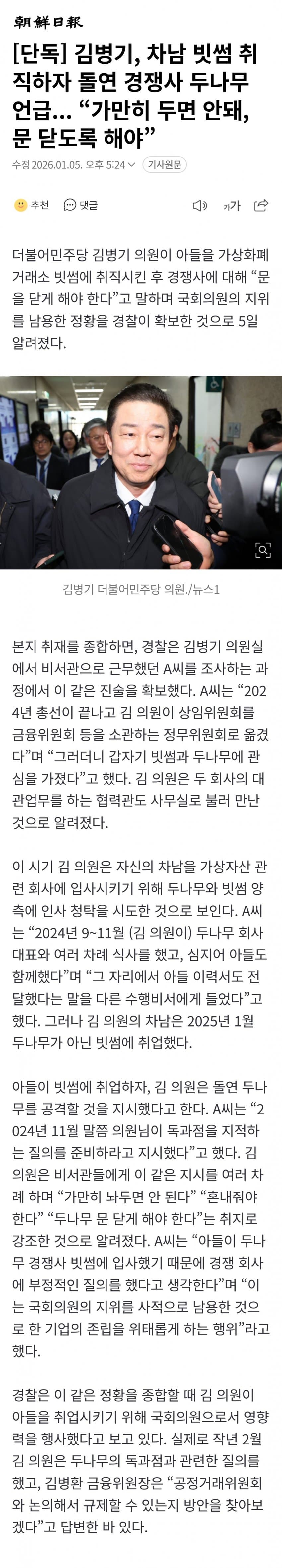 김병기, 아들 빗썸 취직하자 "업비트 혼내줘야"