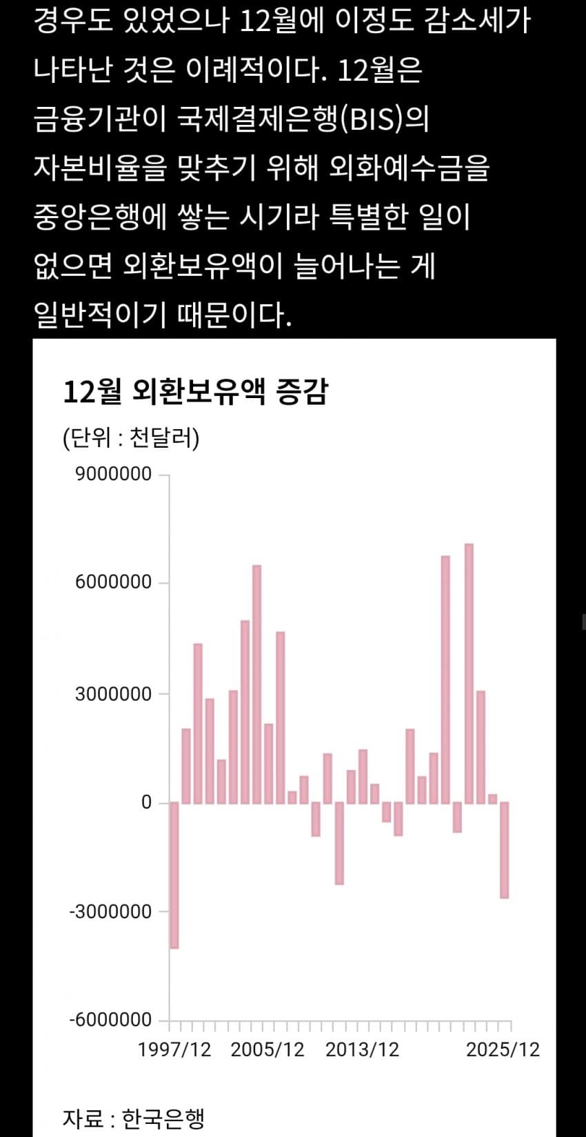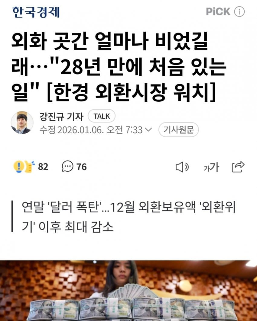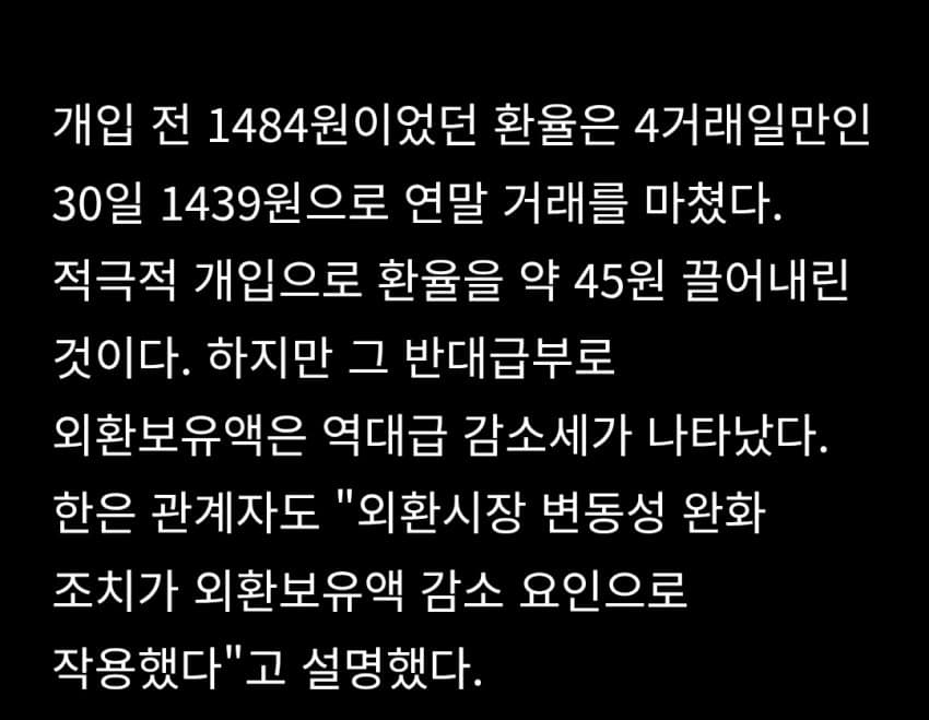 팩트) 외환보유고가 감소한건 맞지만 25년 11월과 같은 수준이다.팩트2) 25년 11월의 4280억 달러는 23년 2월 이후 최대치다.팩트3) 현재 외환보유고는 23년 2월 이후 25년 12월 전의 최대치와 같다.팩트4) 22년 12월엔 4160억달러였고, 23년 12월엔 4170억달러, 24년 12월엔 4150억달러였다.판단은 알아서