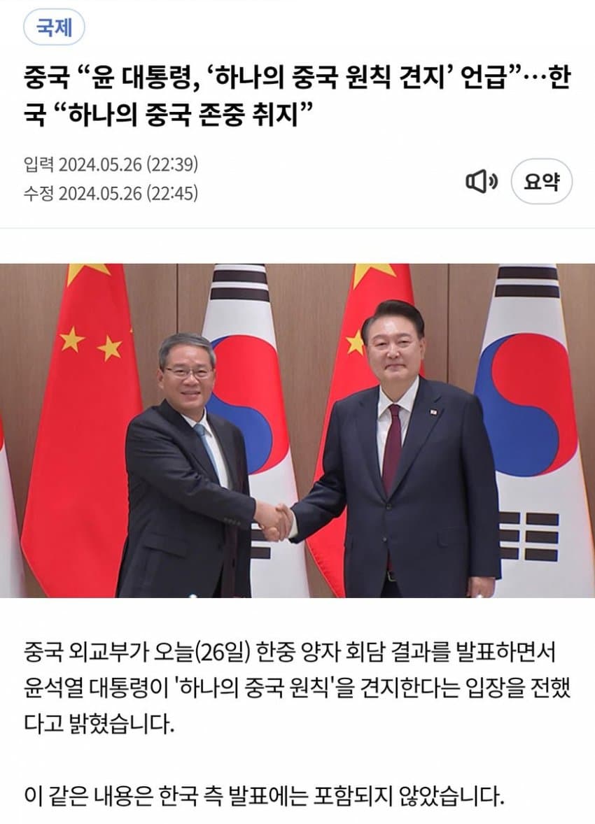 참고로 하나의 중국 원칙은 1992년 수교 이후 한국 역대 정권이 일관되게 인정해온 내용임