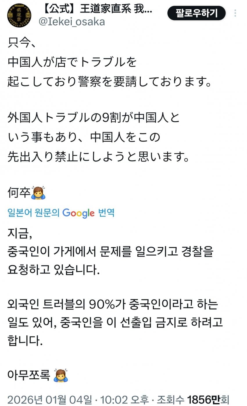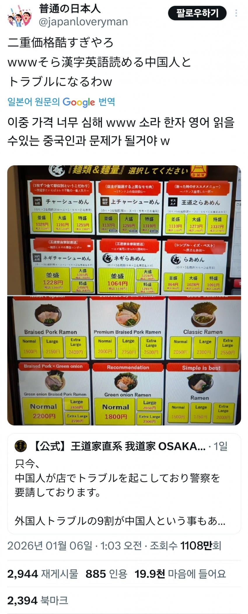 일본 오사카의 어떤 라멘 가게가 중국인을 밴 하겠다고 공지를 올렸음