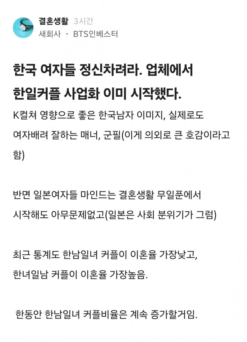 저렇게 해도 일본여자가 쌩판 가족 지인 없이 한국와서 살면 결국 향수병때문에 일본 돌아가려한다는거임 같이 일본의 이민갈거 아님 그것도 쉽지 않음