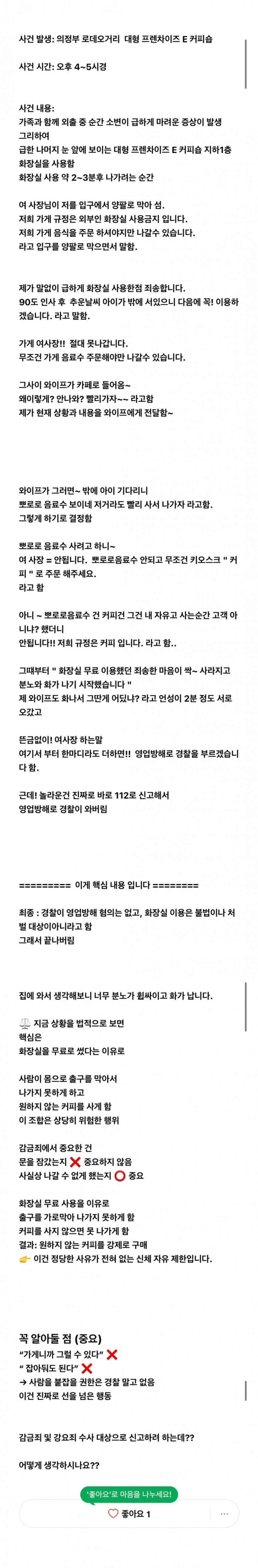 누구나 급하게 화장실 이용할 수도 있고 그런 순간 온다.근데 문앞에서 사장이 막고 못나가게 하면 기분이 나쁘지.그럼에도 성인답게 화장실이용료도 3000원 주려고 한 장면이 저기 tv에도 나오네.밖에 아기랑 아내있어서 현금 빨리 주고 나가려고 하는 것도 안받고 무조건 커피사라고 하면 안되지